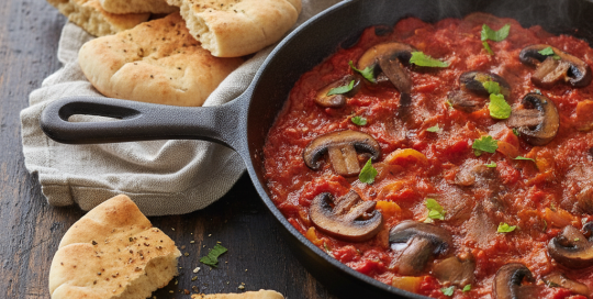 Shakshuka with mushrooms and pita bread